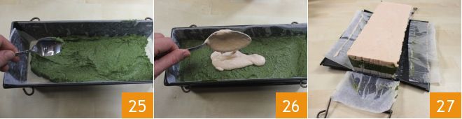 Wenn die Mischung kalt und fest ist, fügen Sie die zweite Schicht, die aus Spinat besteht, hinzu, glätten Sie sie gut und stellen Sie die Mischung für weitere zwanzig Minuten zurück in den Gefrierschrank 25. Gießen Sie schließlich die Lachs-Mischung in die Form, glätten Sie sie gut und lassen Sie sie für mindestens 4 Stunden im Kühlschrank 26. Nach der angegebenen Zeit nehmen Sie die Terrine aus Fisch und Spinat aus der Form und servieren sie kalt 27.