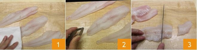 Um die Fischburger zuzubereiten, beginnt mit dem Säubern der Kabeljau-Filets: Spült sie unter fließendem Wasser ab, trocknet sie gut mit einem Küchentuch 1, entfernt eventuell vorhandene Gräten mit einer Küchenpinzette 2. Schneidet die Filets in Stücke 3