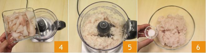 und legt sie in den Mixer 4, hackt den Kabeljau, bis ihr eine homogene Masse erhaltet 5. Übertragt die Mischung in eine Schüssel und würzt sie mit Salz 6,