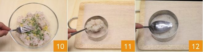 vermengt alles gut mit einer Gabel 10. Legt ein Blatt Backpapier auf ein Schneidebrett und beginnt, den Fischburger zu formen. Verteilt mit einem Löffel die Kabeljaumasse in einem Servierring mit einem Durchmesser von 7 cm 11 und drückt sie mit dem Löffelrücken 12 fest, damit die Masse die Form des Servierrings annimmt.