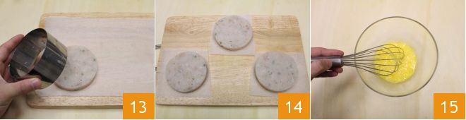 Zieht den Servierring ab 13 und schneidet das Backpapier um die Burger herum ab, so könnt ihr sie leichter anheben, ohne dass sie zerfallen 14. Jetzt kümmert euch um die Panade: Schlagt die Eier mit Salz und Pfeffer 15.