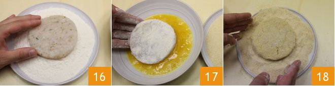 Beginnt, die Fischburger zu panieren, indem ihr sie zuerst in Mehl 16, dann in die Eier 17 und zuletzt in Paniermehl 18 taucht.