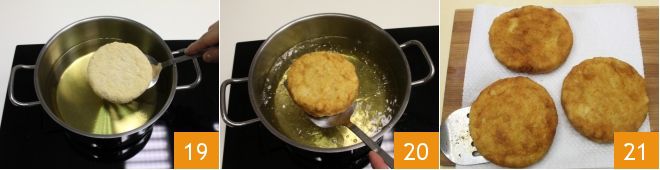Stellt einen Topf mit Pflanzenöl auf den Herd und erhitzt das Öl auf eine Temperatur von 160°-170°, taucht die Fischburger mit einem Schaumlöffel ein 19, bratet sie 4 Minuten pro Seite, bis die äußere Kruste am Burger entsteht (alternativ könnt ihr die Fischburger bei 180° im statischen Ofen für 25-30 Minuten oder bei 160° im Umluftofen für etwa 20 Minuten backen). Nach dem Garen die Burger abtropfen lassen 20 und auf saugfähigem Papier legen, um das überschüssige Öl aufzunehmen 21. Eure Fischburger sind bereit, heiß serviert zu werden!