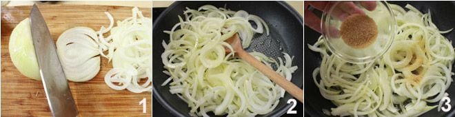 Beginnen Sie mit der Zubereitung der karamellisierten Zwiebeln: Schälen Sie die Zwiebeln und schneiden Sie sie in nicht zu dünne Scheiben 1 (mit einem Messer oder einer Mandoline). Erhitzen Sie das Öl in einer antihaftbeschichteten Pfanne und lassen Sie die geschnittenen Zwiebeln darin anschwitzen 2. Wenn die Zwiebeln durchsichtig sind, fügen Sie den braunen Zucker hinzu 3 und mischen Sie gut.