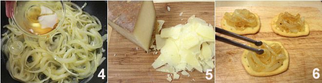 Warten Sie, bis die Zwiebeln karamellisiert sind, und löschen Sie dann mit dem Weißweinessig ab 4. Würzen Sie mit Salz und Pfeffer und vollenden Sie das Garen der Zwiebeln. Reduzieren Sie den Castelmagno-Käse zu dünnen Spänen 5 und geben Sie auf jeden Fladen von „La Bottega di Olivia&Marino“ einen Löffel karamellisierte Zwiebeln 6 und garnieren Sie mit dem Käse. Dekorieren Sie jeden Happen mit einem Zweig frischem Thymian.
