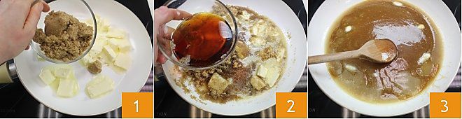 Um den Flapjack zuzubereiten, geben Sie die in Stücke geschnittene Butter, den braunen Zucker 1, das Salz und den Golden Syrup 2 in eine große Pfanne und erhitzen Sie alles bei niedriger Hitze (ohne es zum Kochen zu bringen), während Sie mit einem Löffel 3 umrühren, bis der Zucker vollständig aufgelöst ist. Sobald Sie eine bernsteinfarbene und ziemlich flüssige Masse erhalten haben, schalten Sie die Hitze aus und lassen Sie sie abkühlen. Wenn Sie keinen Golden Syrup finden, können Sie die gleiche Menge Ahornsirup oder Akazienhonig verwenden, obwohl das Ergebnis nicht optimal sein wird.