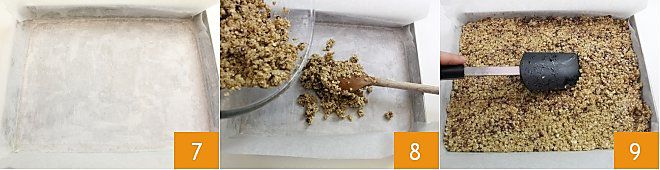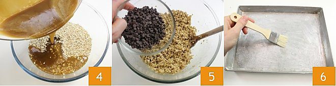 In einer großen Schüssel die Haferflocken geben und die vorbereitete Sirupmasse hinzufügen 4. Gut umrühren, damit die Haferflocken den Sirup aufnehmen. So erhalten Sie eine feuchte und klebrige Masse. Fügen Sie schließlich die Schokoladenstückchen hinzu 5. Bereiten Sie nun das Backblech vor: Nehmen Sie ein rechteckiges Blech mit einer Breite von 20 cm, einer Länge von 30 cm und einer Randhöhe von 3 cm, und buttern Sie den Boden und die Wände mit einem Küchenpinsel 6 oder einfach mit den Händen ein (auf diese Weise haftet das Backpapier besser).