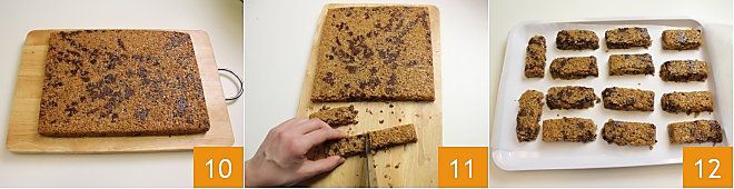 Wenn die Oberfläche goldbraun ist, nehmen Sie das Blech aus dem Ofen, lassen Sie es 15-20 Minuten abkühlen, nehmen Sie dann die Masse aus dem Blech, legen Sie sie auf ein Schneidebrett 10 und schneiden Sie sie in Rechtecke von 7 cm x 2,5 cm (11-12). Die Flapjacks sind fertig zum Genießen!