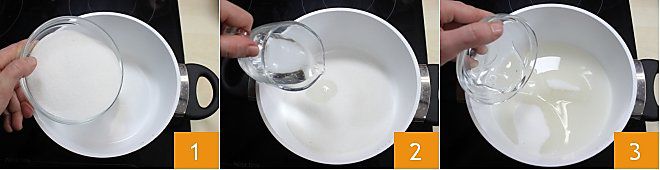 Um den Fondantzucker herzustellen, beginnen Sie damit, einen kleinen Topf auf das Feuer zu setzen und den Kristallzucker 1 zusammen mit dem Wasser 2 und der Glukose 3 zu schmelzen.