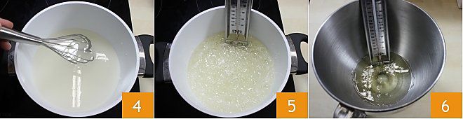 Halten Sie die Flamme auf niedriger Stufe und rühren Sie die Mischung mit einem kleinen Schneebesen um, bis sie eine Temperatur von 114°-115° erreicht (4-5). Um die Temperatur zu überprüfen, ist ein Zuckerthermometer notwendig. Wenn der Zucker diese Temperatur erreicht hat, geben Sie ihn in eine Schüssel 6,