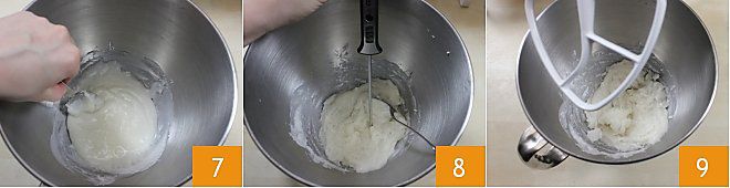 und kühlen Sie ihn unter Rühren mit einem Löffel ab, bis er eine Temperatur von 60 Grad erreicht (7-8). An diesem Punkt verarbeiten Sie ihn in der Küchenmaschine mit einem Blattaufsatz, bis Sie einen weißen und kompakten Block erhalten 9.