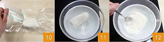 Sobald Sie den Block erhalten haben, können Sie ihn im Kühlschrank aufbewahren, indem Sie ihn vakuumverpacken oder in einen Lebensmittelbeutel legen und so viel Luft wie möglich entfernen 10. Wenn Sie ihn jedoch sofort verwenden möchten, überspringen Sie diesen Schritt und geben Sie den Block in einen Topf im Wasserbad 11, bis er wieder flüssig wird. Achten Sie darauf, 60° nicht zu überschreiten 12, da sonst beim Glasieren der Gebäckstücke der Fondantzucker Risse bildet und matt wird.
