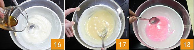 Wenn Sie ihn hingegen mit Karamell aromatisieren möchten, bereiten Sie die Karamellsauce zu (hier klicken für das Rezept) und fügen Sie sie dem Fondant hinzu und rühren Sie gut um, wobei Sie die Temperatur stets bei 60 Grad halten (16-17). Alternativ können Sie auch Lebensmittelfarben verwenden, vorzugsweise in Pulverform, und sie mit dem Fondantzucker mischen, um die gewünschten Farbtöne zu erzielen 18. Auch in diesem Fall sollten Sie die Temperatur bei 60 Grad halten. Sollte der Fondantzucker zu trocken werden, können Sie durch Zugabe von ein wenig heißem Wasser wieder die richtige Konsistenz erzielen.