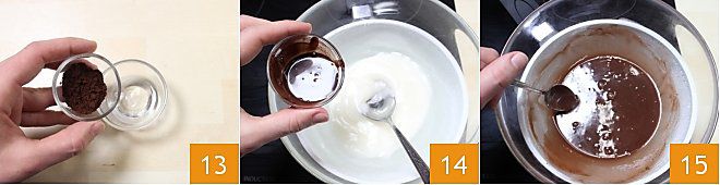 An diesem Punkt können Sie den Fondantzucker je nach gewünschter Zubereitung aromatisieren. Wenn Sie zum Beispiel Fondantzucker mit Kakao zubereiten möchten, lösen Sie das Kakaopulver in einem Schluck Wasser auf 13, fügen Sie es dem Fondantzucker hinzu 14 und rühren Sie gut um, bis Sie eine gleichmäßige Farbe erhalten 15. Wir empfehlen Ihnen, dies zu tun, während Sie den Fondantzucker im Wasserbad bei einer Temperatur von 60 Grad halten.