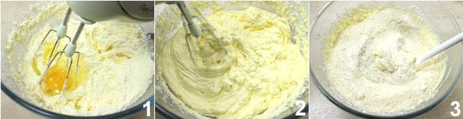 Um die Frangipanecreme zuzubereiten, beginnen Sie damit, die zimmerwarme Butter mit dem Zucker mit einem elektrischen Mixer cremig zu schlagen. Wenn die Mischung gut aufgeschlagen ist, fügen Sie die beiden Eier nacheinander hinzu 1, während Sie weiterhin mit dem elektrischen Mixer mixen 2. Zum Schluss das Mandelmehl hinzufügen und gut mit einem Holzlöffel vermischen, um es mit der Butter-, Zucker- und Eiermischung 3 zu verbinden.