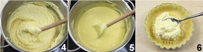Bringen Sie die Mischung nun auf den Herd 4 und kochen Sie die Creme, bis sie eindickt 5 (die Konsistenz sollte der von Puddingcreme sehr ähnlich sein, auch wenn sie etwas krümeliger ist); wenn die Creme zu kochen beginnt, können Sie die Hitze ausschalten.