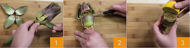 Das Erste, was man für die frittierten Artischocken mit Senf tun muss, ist, die Artischocken zu reinigen: Entfernt die äußeren, härteren Blätter 1, schneidet den oberen Teil der Artischocken ab 2 und den Stiel, indem ihr ihn direkt unterhalb der Basis der Artischocke abschneidet (um zu sehen, wie, klicke hier), und behaltet nur das Herz, um zu verhindern, dass die Artischocken während der Zubereitung dunkel werden, bestreicht sie mit der Hälfte einer Zitrone 3