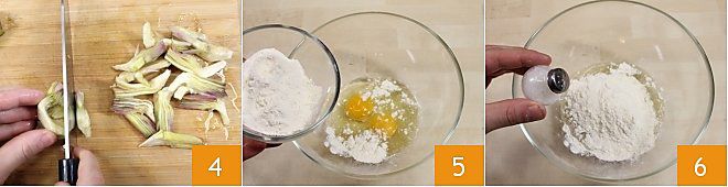 Nach dem Reinigen der Artischocken geht es an die Zubereitung des Teigs: In einer großen Schüssel die Eier einfüllen, das Mehl 5, das Salz 6 hinzufügen,