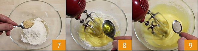 den Senf und mithilfe eines Mixers oder Rührgeräts einen Teig herstellen 7, indem ihr während der Zubereitung auch den Esslöffel Öl 8 und den Teelöffel Hefe 9 hinzufügt; falls der Teig zu dick sein sollte, fügt 1 oder 2 Esslöffel lauwarmes Wasser hinzu (umgekehrt, fügt wenig Mehl hinzu).