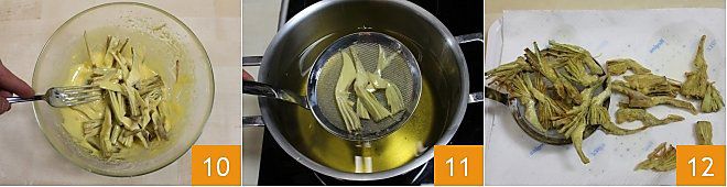 Die abgetropften und getrockneten Artischocken in den Teig geben und einige Minuten gut einziehen lassen 10. In der Zwischenzeit das Pflanzenöl (oder Olivenöl, wenn gewünscht) erhitzen, in dem die Artischockenstücke einzeln eingetaucht werden, darauf achten, dass sie nicht aneinander kleben 11; wendet sie ein paar Mal, um sie auf der ganzen Oberfläche zu bräunen. Je nach Größe der Artischocke sind sie in 5/7 Minuten fertig, dann aus dem Öl nehmen und auf Küchenpapier abtropfen lassen 12; noch heiß servieren, eventuell mit einer Prise Salz bestreuen.