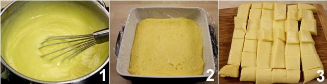 Um die frittierte Creme zuzubereiten, beginnen Sie mit der Zubereitung der Puddingcreme in den angegebenen Mengen. Kochen Sie die Creme gut, bis sie eine ziemlich feste Konsistenz hat 1, dann gießen Sie sie in eine mit Frischhaltefolie ausgekleidete Backform und verteilen Sie sie so, dass sie etwa 2 cm dick ist (wir haben für diese Menge eine quadratische Form von 22x22 cm verwendet) 2. Glätten Sie die Creme gut mit einem Spatel und lassen Sie sie dann an einem kühlen und trockenen Ort etwa 2 Stunden abkühlen (stellen Sie die Creme nicht in den Kühlschrank und decken Sie sie nicht ab, sonst bleibt sie sehr feucht). Wenn die Creme gut kalt ist, transferieren Sie sie auf ein Schneidebrett und schneiden Sie sie in Würfel oder Rauten, indem Sie ein scharfes Messer verwenden 3.