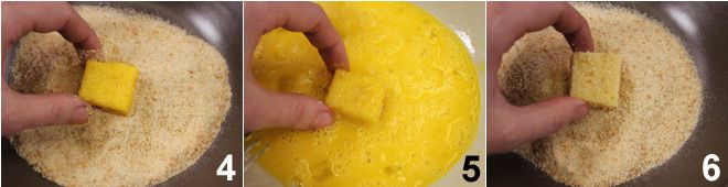 Wenden Sie jedes Stück Creme zuerst in Paniermehl 4, so dass es gut auf allen Seiten bedeckt ist, dann in das geschlagene Ei 5 und dann nochmals in Paniermehl 6.