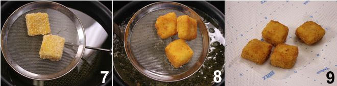 Frittieren Sie die Cremeecken in heißem Erdnussöl 7, bis sie goldbraun sind. Heben Sie sie mit einem Schaumlöffel heraus 8 und legen Sie die frittierte Creme auf ein Papiertuch, um das überschüssige Öl zu entfernen 9. Mit dieser Menge erhalten Sie etwa 40 Stück frittierte Creme!