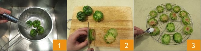 Um die frittierten grünen Tomaten zuzubereiten, waschen Sie die Tomaten unter fließendem Wasser 1, schneiden Sie sie dann quer, um etwa 1 cm dicke Scheiben zu erhalten 2. Legen Sie sie nun auf einen Rost, salzen Sie sie und lassen Sie sie etwa 30 Minuten abtropfen, damit sie einen Teil ihres Pflanzensafts verlieren 3.