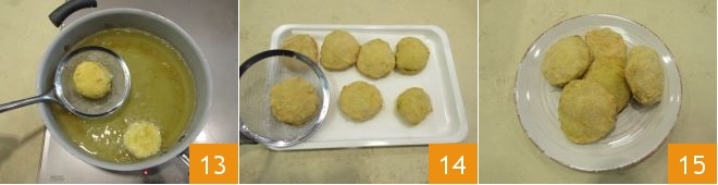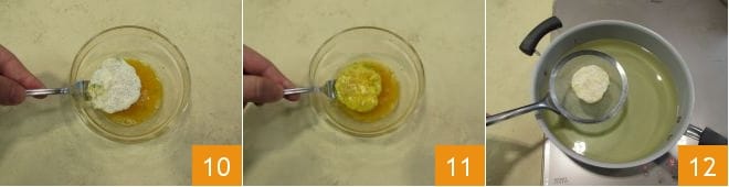Wiederholen Sie denselben Vorgang noch einmal, tauchen Sie die gerade panierten Tomaten erneut in das Ei (10-11) und schließlich wieder in die Mehle. Dann frittieren Sie sie, ein paar Stücke auf einmal, in reichlich heißem Öl 12.