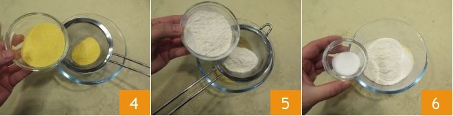 In einer Schüssel sieben Sie zuerst das Maismehl 4 und dann in derselben Schüssel auch das Mehl 00 5. Fügen Sie dann den Zucker hinzu 6 und rühren Sie mit einem Löffel, bis eine gleichmäßige Mischung entsteht.