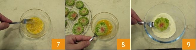 In einem anderen Behälter schlagen Sie die Eier mit Salz und Pfeffer 7. Nach 30 Minuten nehmen Sie Ihre Tomatenscheiben und tauchen Sie sie zuerst in das Ei 8 und dann in die Mehlmischung 9.