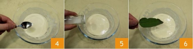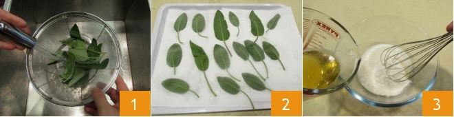 drehen Sie sie auf beiden Seiten 7, bis sie vollständig bedeckt sind 8. Erhitzen Sie das Samenöl auf dem Herd und überprüfen Sie mit einem Küchenthermometer, dass es eine Temperatur von 170 °C erreicht. Frittieren Sie nun die Salbeiblätter in kleinen Mengen 9: