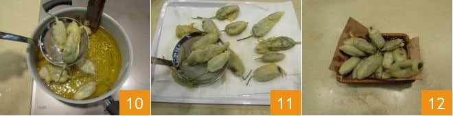 wenn die Blätter goldbraun sind, nehmen Sie sie mit einem Schaumlöffel aus dem Öl 10 und lassen Sie sie auf Küchenpapier abtropfen 11. Würzen Sie mit Salz und servieren Sie die frittierten Salbeiblätter im Teigmantel sofort 12.