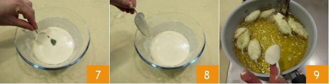 rühren Sie weiter, bis Sie einen glatten Teig ohne Klumpen erhalten 4, dann salzen Sie nach Belieben 5. Sobald der Teig fertig ist, tauchen Sie die Salbeiblätter einzeln in den vorbereiteten Teig 6,
