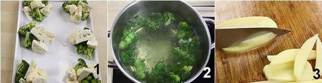 Um das gemischte frittierte Gemüse und den Käse zuzubereiten, beginnen Sie damit, das Gemüse vorzubereiten: Reinigen und schneiden Sie den Blumenkohl und den Brokkoli in kleine Stücke 1, kochen Sie die Brokkoli 3 Minuten 2 und den Blumenkohl 5 Minuten in kochendem Wasser, sie sollten knackig bleiben. Schneiden Sie die Kartoffeln in dünne Scheiben 3 und kochen Sie sie für 1 Minute in gesalzenem, kochendem Wasser.