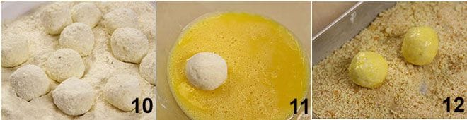 und mischen Sie alles 7, um etwa 15 g schwere Bällchen zu formen 8. Schließlich schneiden Sie den restlichen Provolone in Scheiben 9. Bereiten Sie alles Notwendige für die Panade vor: Schlagen Sie in einer Schüssel die Eigelbe mit dem Salz und legen Sie Mehl und Paniermehl auf zwei große Tabletts.