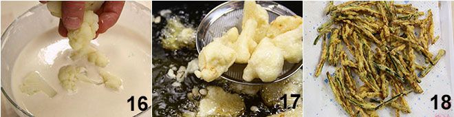 Tauchen Sie die Blumenkohlhäppchen 16, Brokkoli, Zucchini und die restlichen Artischocken in den Teig, frittieren Sie sie 17 und lassen Sie sie abtropfen. Beenden Sie das Frittieren mit den panierten Käsen und Artischocken. Achten Sie darauf, das gesamte Gemüse und den Käse auf einem Küchenpapier abzutropfen, um überschüssiges Öl zu entfernen 18. Servieren Sie die frittierte Mischung aus Gemüse und Käse sofort heiß und knusprig!