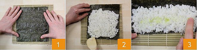 Um den Futomaki vorzubereiten, legen Sie ein ganzes Blatt Nori-Alge auf die spezielle Matte 1 (Sie können sie auch mit Frischhaltefolie bedecken, wenn Sie möchten), wobei die glattere und glänzendere Seite nach unten zeigt. Befeuchten Sie Ihre Hände in einer Schüssel mit Wasser, das möglicherweise mit ein paar Esslöffeln Reisessig angesäuert ist, und nehmen Sie etwa 100 g Sushi-Reis. Das Befeuchten der Hände ist notwendig, da der Reis sehr klebrig ist und so verhindert wird, dass er an den Händen klebt. Verteilen Sie den Reis auf der Oberfläche der Alge (Sie können dabei einen Holzspatel zur Hilfe nehmen), wobei Sie ein paar Zentimeter Alge am oberen Rand frei lassen 2. Die Dicke des Reises sollte nicht zu hoch sein. Wenn Sie möchten, können Sie eine kleine Menge Wasabi nehmen und es in der Mitte auf dem Reis verteilen, nicht zu viel, da Wasabi scharf ist 3. Wenn Sie Wasabi nicht mögen, können Sie diesen Schritt weglassen.