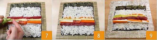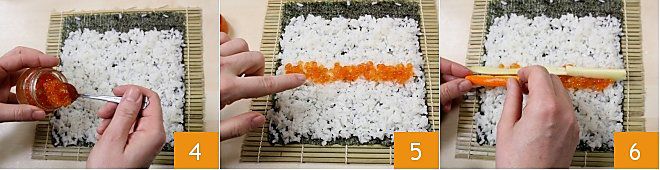 Nehmen Sie etwa einen Esslöffel Fischrogen 4 und platzieren Sie ihn in der Mitte des Reises 5, dann legen Sie die Stäbchen der verschiedenen Zutaten in der Weise an, die Ihnen am besten gefällt 6, wobei Sie daran denken, dass der Futomaki mindestens 4 Zutaten erfordert.