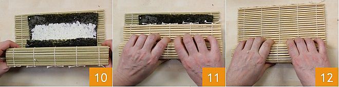 Nehmen Sie jetzt den unteren Rand der Matte 8 und rollen Sie alles wie ein Röllchen, indem Sie die zentrale Zutat mit den Fingern nach innen drücken. Halten Sie einen sanften Druck auf die Rolle, damit sie kompakt bleibt, bis Sie den Streifen der Alge sehen, der nicht mit Reis bedeckt ist 9; schieben Sie dann das Röllchen ein wenig voran, damit der freiliegende Nori-Streifen alles versiegelt: die Feuchtigkeit des Reises fungiert als Klebstoff. An diesem Punkt formen Sie die Rolle, indem Sie gleichmäßig mit den Händen entlang der Länge drücken 10.