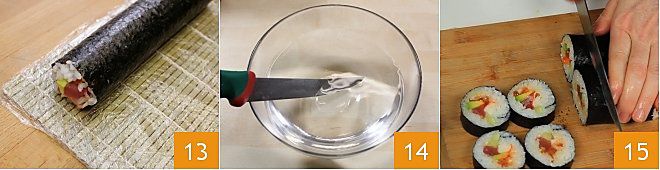 Hier ist der Futomaki bereit 11: Drücken Sie die herausragenden Reiskörner an den Seiten nach innen. Es bleibt nur, den Futomaki zu schneiden: Legen Sie ihn auf ein Schneidebrett und befeuchten Sie die Klinge des Messers mit dem angesäuerten Wasser 14; schneiden Sie ihn in der Mitte, stellen Sie die beiden erhaltenen Stücke nebeneinander und schneiden Sie sie dann in sechs gleich große Teile 15, so erhalten Sie 12 Stücke Futomaki.