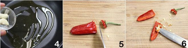 fügt dann zwei Knoblauchzehen hinzu und lasst sie goldbraun werden 4. Bereitet in der Zwischenzeit den Chili vor: wascht ihn, entfernt den Stiel 5 und schneidet ihn in der Mitte durch, um alle Samen zu entfernen 6,