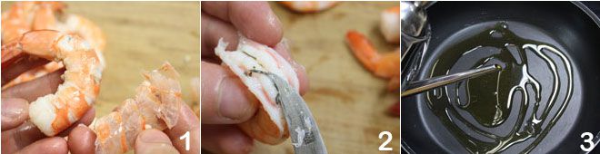 Um die Tapa Garnelen mit Knoblauch und Chili zuzubereiten, beginnt ihr mit dem Reinigen der Garnelen: schält sie 1 und entfernt mit einem Messer den schwarzen Darmfaden 2. Erhitzt eine Pfanne mit 6 Esslöffeln extra nativem Olivenöl bei mittlerer Hitze 3,
