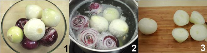 Um gebackene Zwiebeln zuzubereiten, beginnen Sie damit, die Zwiebeln zu schälen und zu putzen 1, dann kochen Sie sie 7/8 Minuten in reichlich gesalzenem Wasser 2. Lassen Sie sie abtropfen und halbieren Sie sie mit einem scharfen Messer 3.