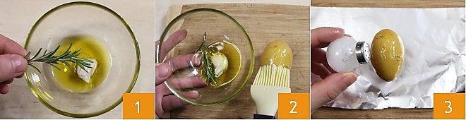 wickeln Sie die Kartoffeln in eine Alufolie 4. Backen Sie die Folienkartoffeln im vorgeheizten statischen Ofen bei 200°C 5 für etwa 50 Minuten (oder im Umluftofen bei 180°C für 40 Minuten). Hacken Sie den restlichen Rosmarin 6 und stellen Sie ihn beiseite.