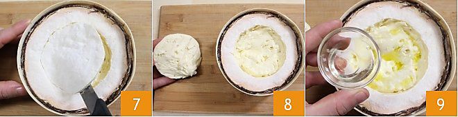 Nehmen Sie nun den Vacherin-Laib, schneiden Sie mit einem Messer einen Kreis auf der Oberseite 7 und heben Sie die Kruste ab 8. Verfeinern Sie den Vacherin mit dem Weißwein 9