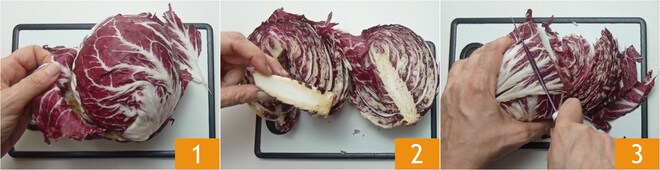 Um den Radicchio in der Pfanne zuzubereiten, entfernen Sie zuerst die äußeren Blätter 1, dann teilen Sie den Kopf in zwei Hälften und entfernen den zentralen Strunk 2. Schneiden Sie schließlich die Blätter in Streifen 3.