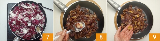 Salzen und pfeffern Sie 7, dann umrühren und bei mittlerer bis niedriger Hitze etwa 15 Minuten kochen. Wenn der Radicchio weich geworden ist und seine Farbe verändert hat, schalten Sie die Hitze aus und entfernen die Knoblauchzehen 8. Garnieren Sie den Radicchio in der Pfanne mit den Walnusskernen direkt vor dem Servieren 9!
