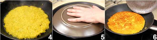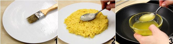 Um den gebratenen Reis zuzubereiten, fetten Sie zuerst einen Teller ein 1 und teilen Sie den Reis in 4 gleich große Portionen (wenn Sie nicht wissen, wie man gelben Reis zubereitet, schauen Sie hier nach klicken Sie hier), dann nehmen Sie eine Portion und drücken sie mit dem Rücken eines Löffels 2 flach, um eine dünne Scheibe zu formen. Erhitzen Sie eine Pfanne mit einem Durchmesser von 24 cm und geben Sie einen Esslöffel Butterschmalz in die Mitte der Pfanne 3 (wenn Sie nicht wissen, wie man es zubereitet, schauen Sie hier nach klicken Sie hier); setzen Sie die Reisscheibe mit einem dünnen und langen Pfannenwender in die Pfanne um, indem Sie darunter gleiten, um sie vom Teller zu lösen. Sollte die Scheibe bei diesem Vorgang zerbrechen, keine Sorge: Formen Sie sie in der Pfanne mit dem Löffelrücken wieder neu.