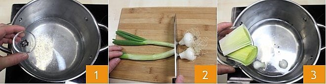 Um den gedämpften Wolfsbarsch mit Gemüse zuzubereiten, kümmern Sie sich zuerst um das Wasser, das Sie für Ihren Dampfgarer benötigen. Nehmen Sie einen Topf, gießen Sie das Wasser hinein und aromatisieren Sie es mit dem Wein und den Pfefferkörnern 1; putzen Sie die Frühlingszwiebeln und entfernen Sie die Stiele, ohne sie wegzuwerfen 2; putzen Sie auch den Lauch, indem Sie den grünen Teil entfernen und die äußeren Blätter entfernen, halbieren Sie ihn und geben Sie einen Teil davon zusammen mit den Frühlingszwiebeln ins Wasser 3. Bringen Sie alles zum Kochen.